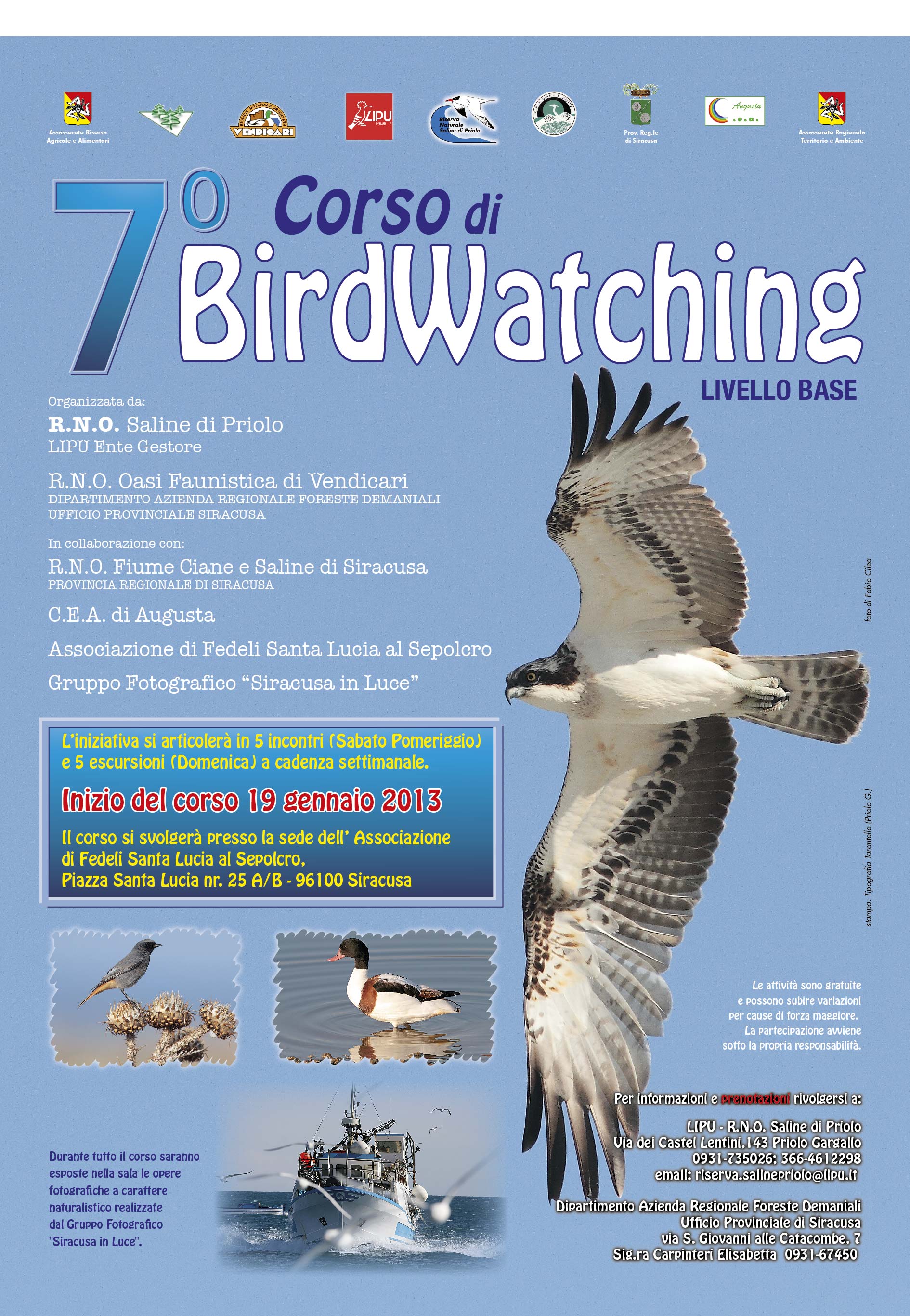 Il 19 Gennaio 2013, prende il via il 7° Corso di Birdwatching –Livello Base -organizzato dalla R.N.O Saline di Priolo (Ente Gestore LIPU) e dalla R.N.O. Oasi Faunistica di Vendicari (Ente GestoreUfficio Provinciale di Siracusa Dipartimento Regionale AziendaForeste Demaniali) in collaborazione con la R.N.O. Fiume Ciane eSaline di Siracusa della Provincia Regionale, il C.E.A di Augusta,l´Associazione di Fedeli di Santa Lucia al Sepolcro, GruppoFotografico “Siracusa in Luce”.