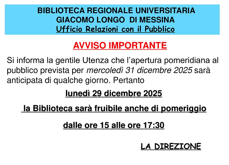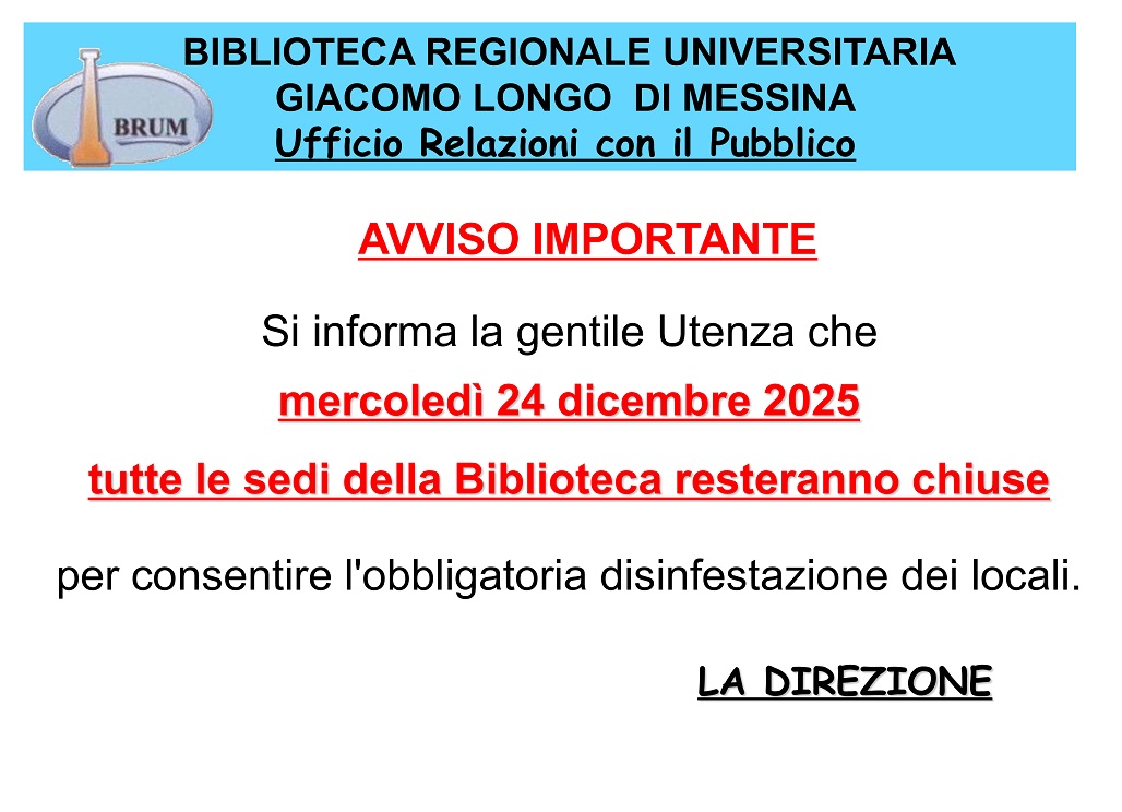 Via I° Settembre n. 117 98100 MESSINA brs.me@regione.sicilia.it urpbibliome@regione.sicilia.it |