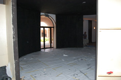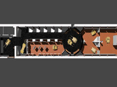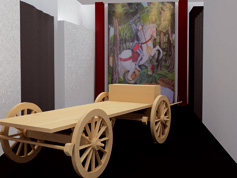 Il simposio un momento della vita sociale greca, in cui persone della stessa estrazione si riunivano, dove si sviluppava la memoria collettiva, poetica e visiva, di un popolo. Questa particolare ambientazione, realizzata in opera con l'utilizzo di pannelli sagomati alti fino al tetto, è costituita a due facce tipo sandwuic con struttura portante in multistrato preverniciato ignifugo, con verniciatura nera opaca. Il simposio rappresenta la sosta al percorso museologico, breve ma utile per leggere e osservare alcune parti costitutive del carretto. |